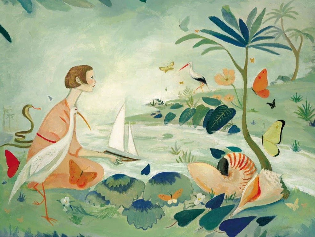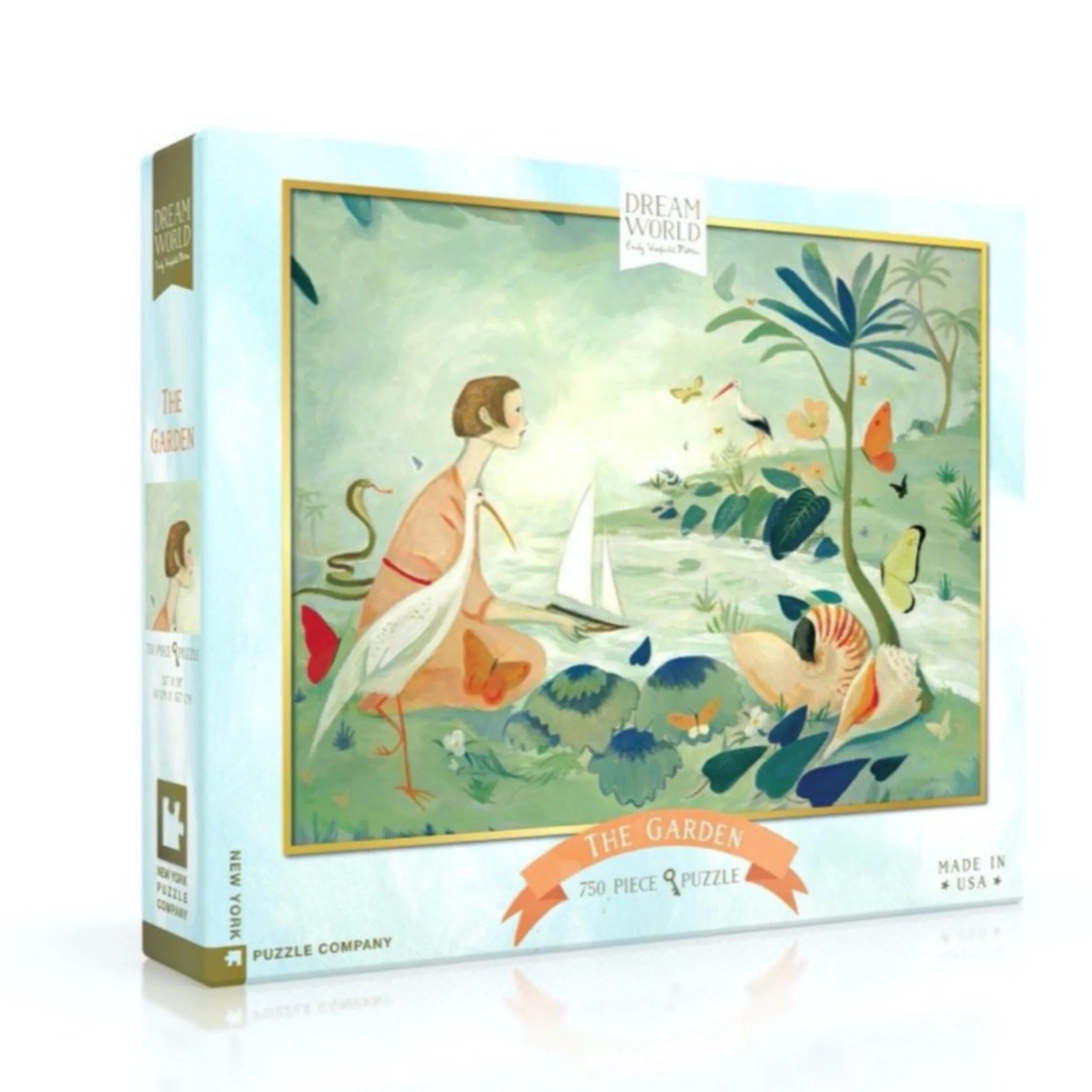 Step into a whimsical, storybook scene with this Emily Winfield Martin “Dream World” 750-Piece Jigsaw Puzzle, featuring a beautiful, detailed illustration of a young girl about to launch her toy boat into a stream, surrounded by colourful butterflies, animals, and shells.