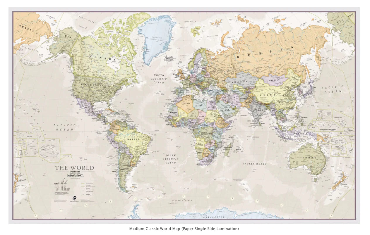 This Classic World Map will be finished with a front sheet lamination process.