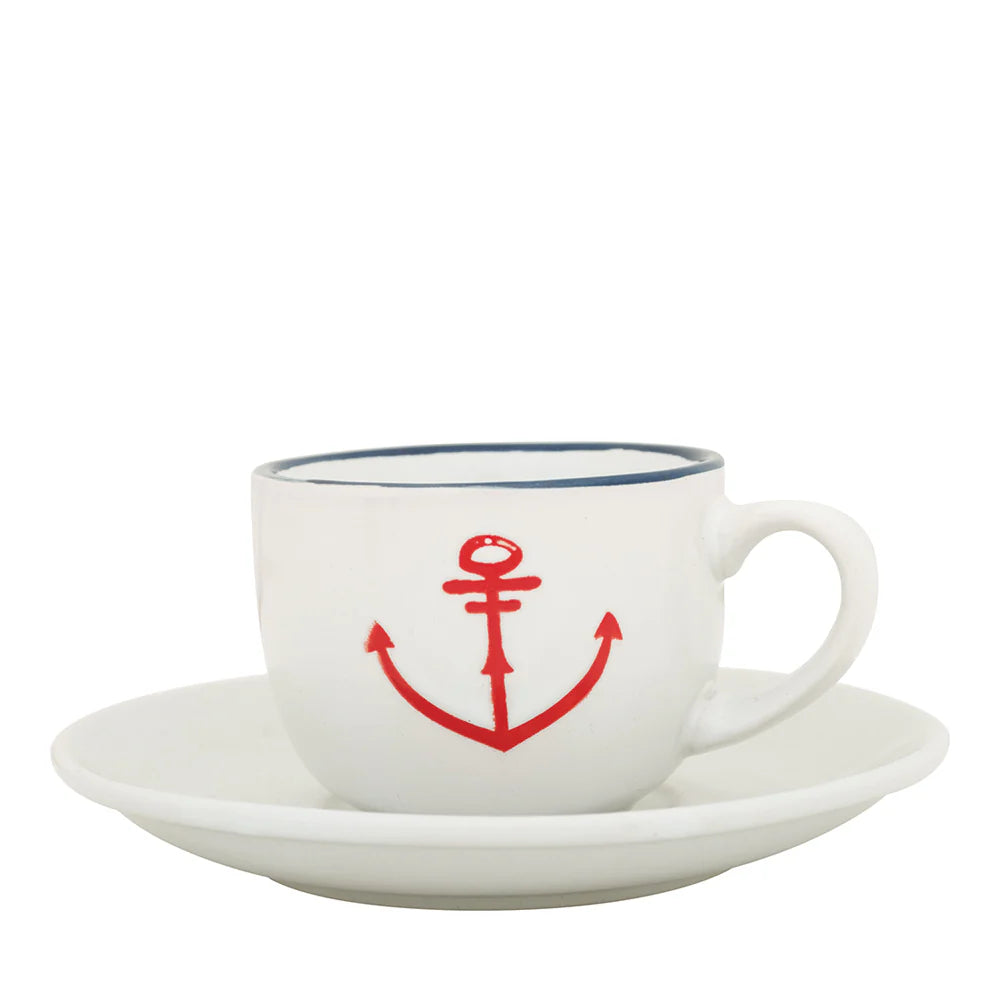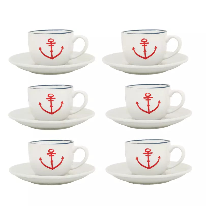 Set of 6 Ceramic Cups & Saucers – Embedded Anchor Design | Nautical Style