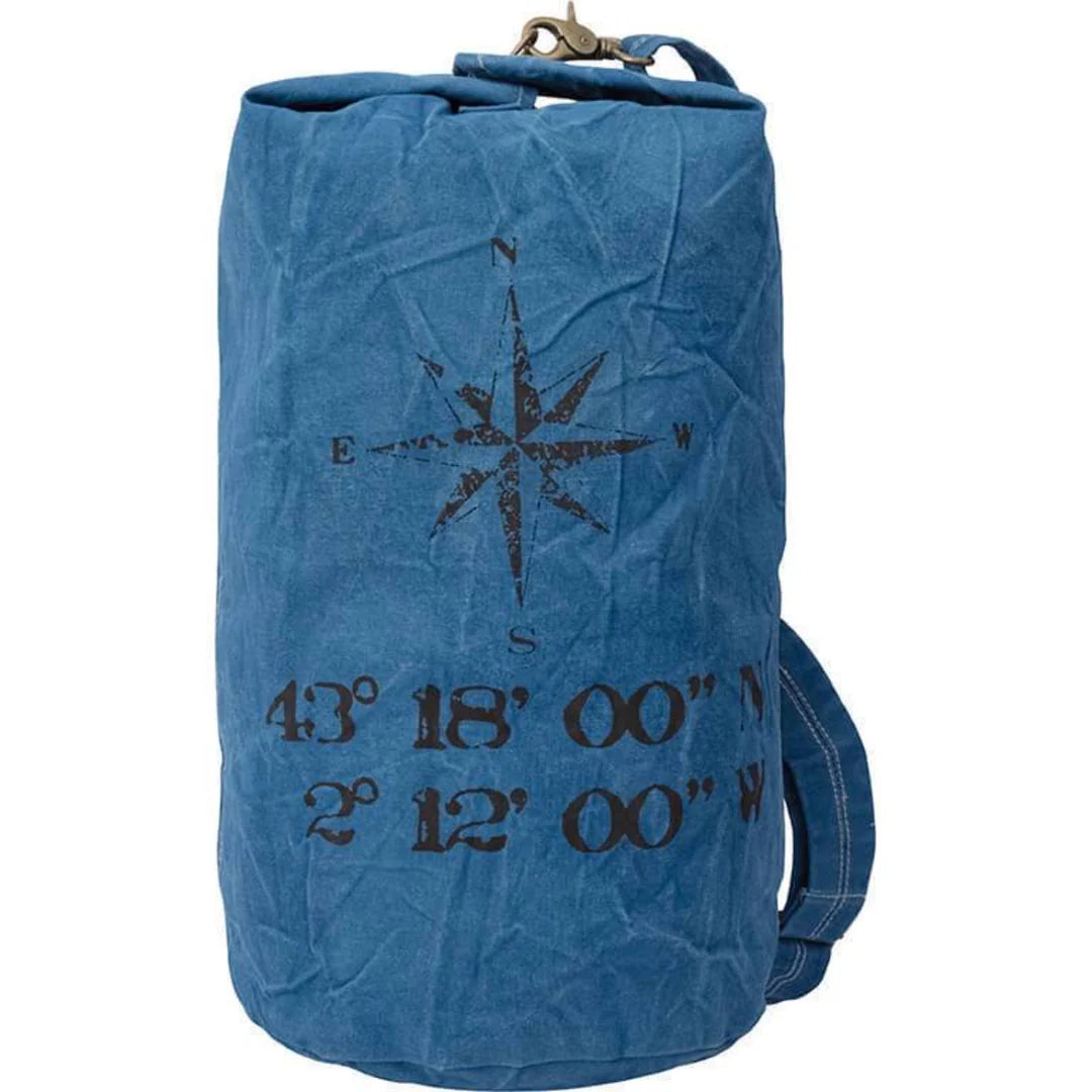 Crafted in light blue canvas with a vintage-inspired Compass Rose, longitude, and latitude print on the front, this bag combines classic explorer aesthetics with practical design. The striped fabric-lined interior includes an open pocket for stowing your smallest essentials.